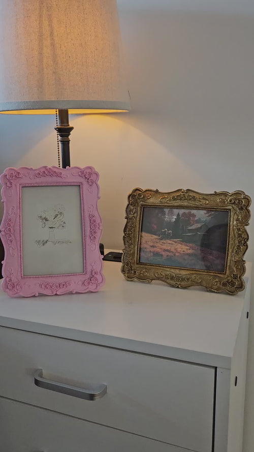 Crafted from resin, the vintage picture frame is finished with a hand-painted surface that highlights the raised floral details and frame edges. It is available in four color options - gold, black, white, and pink, allowing it to coordinate with different room styles and photo themes.