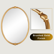 This wall mirror is framed in a traditional-style oval frame. With a classic 1" wide half-round profile, it features 2 decorations on the top and bottom of the frame. The Brushed Gold finish provides a beautiful accent to any room.
